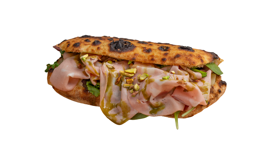 Состојки: Тесто (брашно,вода,квасец,сол), котиџ сирење, свинска мортадела, маслиново масло, песто ф’стак, микс зелена салата, мелен ф’стак